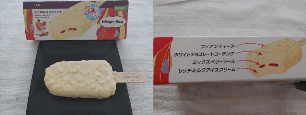 こちらはバーで、リッチミルクアイスクリームの中にストロベリー・ラズベリー・クランベリーの3種のミックスベリーソースが入っています。外側にはまたもやフィアンティーヌが入ったホワイトチョココーティングがされており、チョコのパリパリ感とフィアンティーヌのザクザク感が楽しめます。3種のベリーの一つ一つの味の違いは全く分かりませんが、甘酸っぱいベリーソースとアイスが一緒になって美味しくいただきました。