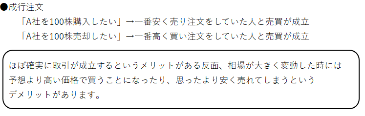 成行注文は確実に購入したい時や株価の下落が予想され損切りしたい時など、タイミングを逃したくない場合に向いています。