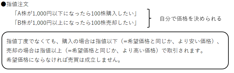 「指値注文」は希望する売買価格を自分で指定して注文すること。