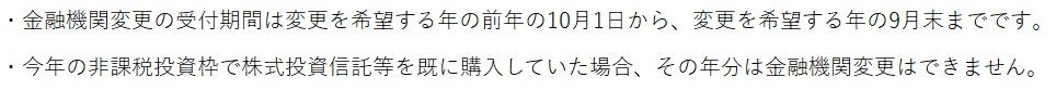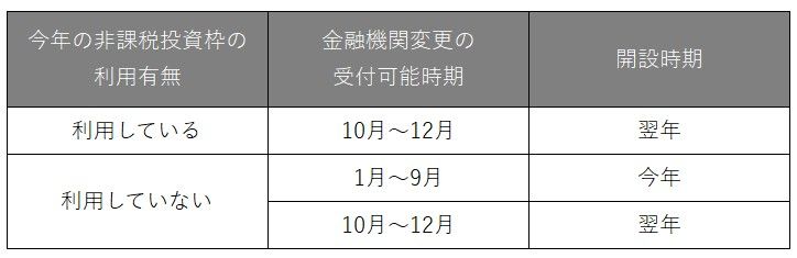 そしてNISA口座の変更にはタイミングがありますので、気をつけてください。変更前の金融機関と今後利用したい金融機関、それぞれで手続きが必要になります。