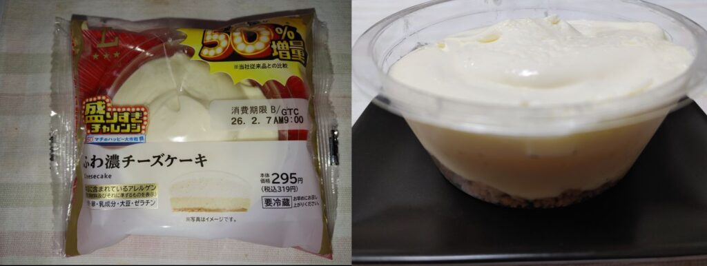 LAWSONの盛りすぎチャレンジ、A子、プレミアムロールケーキ以外は気にしていなかったのですが、第2弾が始まっているというので寄ってみたら、ふわ濃チーズケーキが50%増量になっていました。税込み319円。